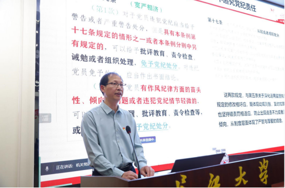 为加强理解运用,会议还邀请校纪委副书记、纪检监察机构综合室主任陈平中对《中国共产党纪律处分条例》总则进行了解读。他对党纪学习的重要性、《条例》产生和修订的5个阶段、《条例》总则各章节新增和修订的内容、新增和修订内容的背景及意义进行了深入讲解。